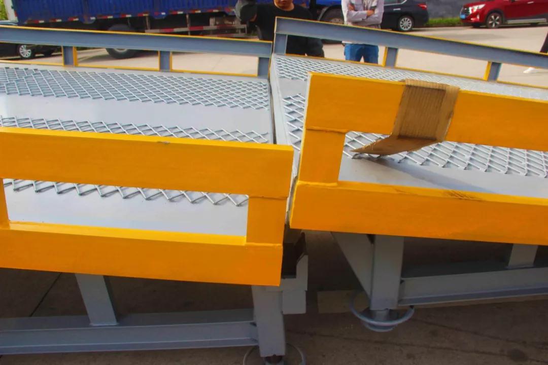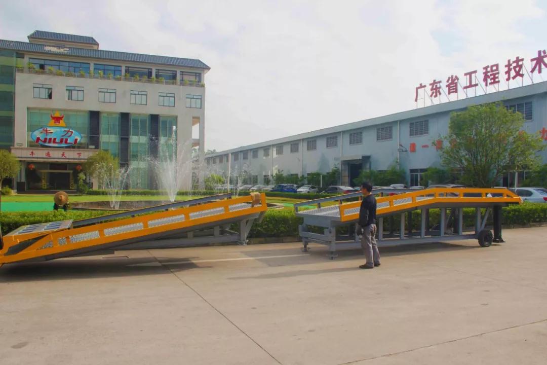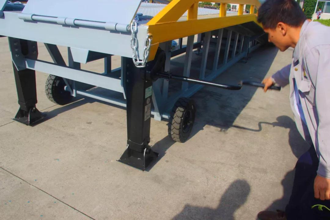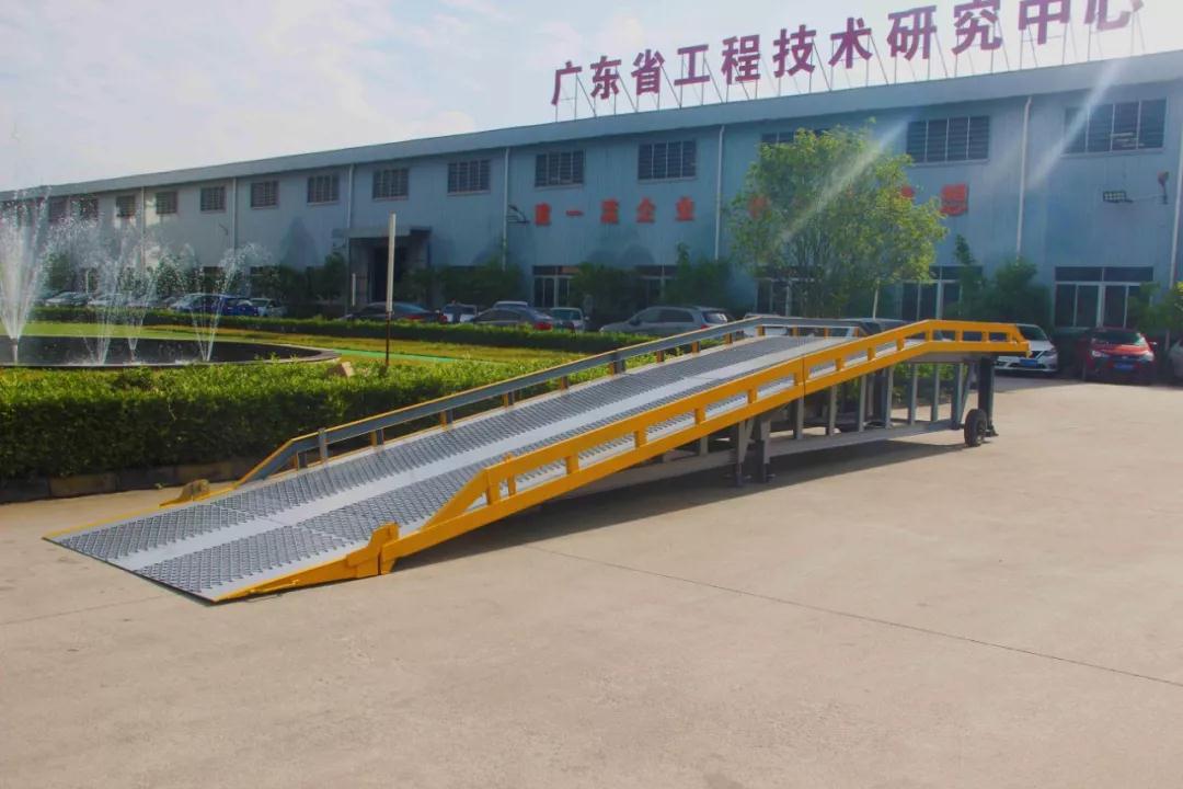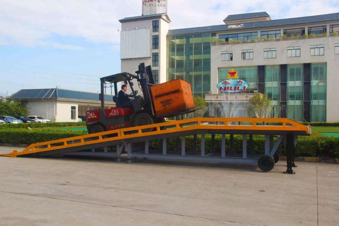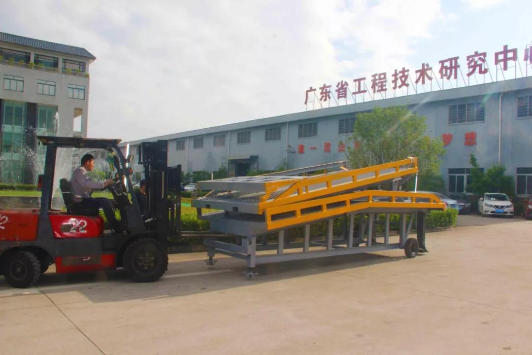 折疊式登車橋是與叉車配合使用的貨物裝卸輔助設備,在地面和車輛之間搭起橋梁,可根據(jù)汽車車廂的高低調節(jié)高度,叉車可以直接通過它駛入車廂內進行貨物的裝卸作業(yè)。