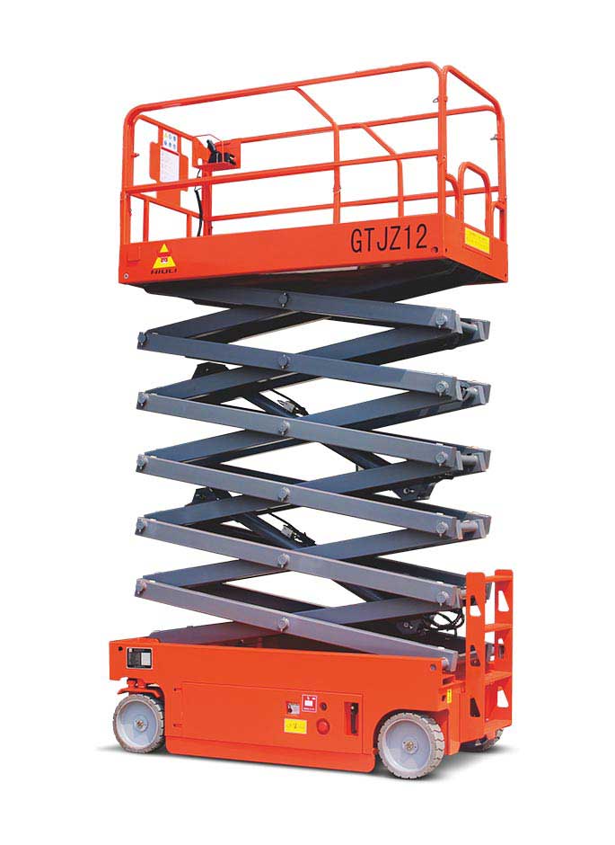 自行走剪叉高空作業平臺采用剪叉結構垂直升降模式,產品作業高度從6米到14米,電動剪叉低噪聲、無空氣污染、防滑、不易刮傷地面。