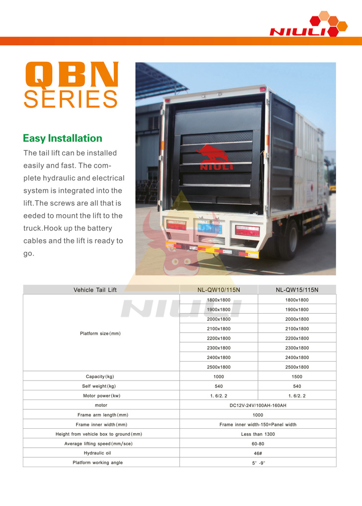 The tail lift can be installed easily and fast.The com-plete hydraulic and electrical system is integrated into the lift.The screws are all that is eeded to mount the lift to the truck.Hook up the battery cables and the lift is ready to go.